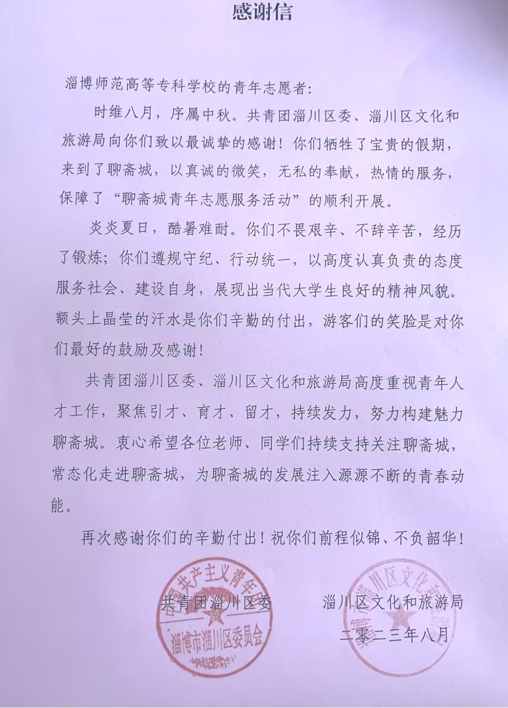 首创“校校共研学”模式,打造出“淄小旅”志愿服务队和“文旅淄博”两支志愿服务队,积极参加公司及淄博市各类志愿服务活动,获得“青年志愿服务工作先进集体”称号。通过打造产教融合新模式,先后获省康养专业100万元办学奖补,开展“一院百村,助力乡村振兴”活动,与西河镇、齐艾产业园进行横向项目研究,获项目资金35万元。