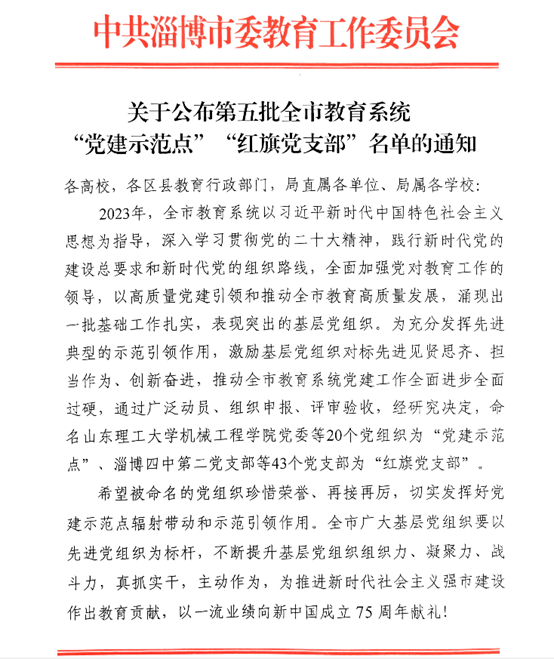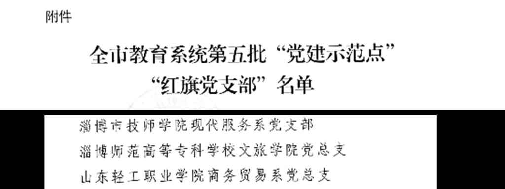 近日,中共淄博市委教育工委组织的全市教育系统第五批“党建示范点”、“红旗党支部”评选工作落定,淄博师专公司党总支荣获“党建示范点”荣誉称号。