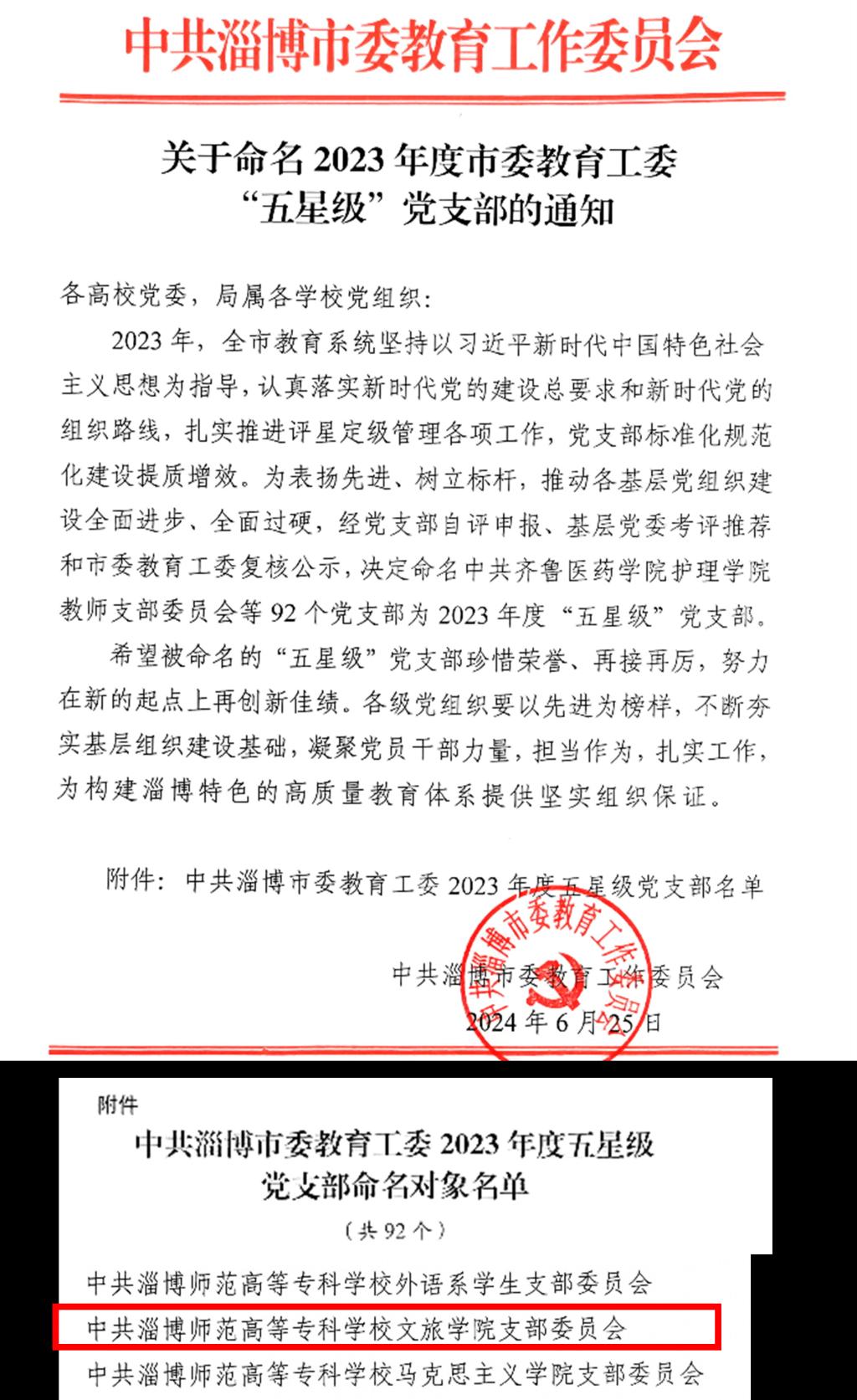 近日,中共淄博市委教育工委组织的“五星级”党支部评选工作落定,淄博师专公司党总支荣获“五星级”党支部荣誉称号。