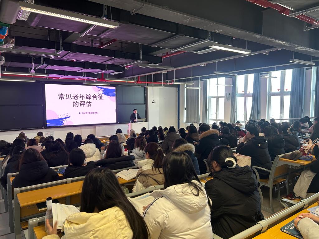 报告中,张轶主任围绕老年人高发的睡眠障碍、疼痛疾病两大核心议题,结合临床典型案例,系统讲解了基于疾病临床表现的评估判断标准与实操要点。他特别强调,老年综合征评估的关键在于精准区分病理疾病与正常增龄性生理变化,叮嘱同学们在今后的学习与实践中,既要锤炼专业鉴别能力,密切关注老年人的细微身体变化,更要贯彻“尊老、敬老、爱老、助老、孝老”的服务理念,以专业素养与人文关怀助力老年健康评估工作提质增效。