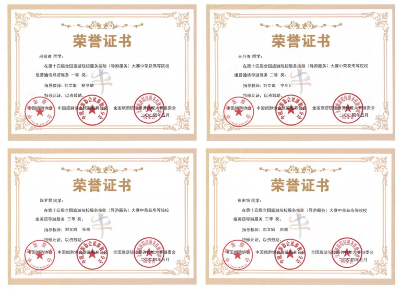 5月23—26日,第十四届全国旅游院校服务技能(导游服务)大赛在郑州举行,公司学子获得一等奖1项,二等奖1项,三等奖2项,并荣获团体奖。