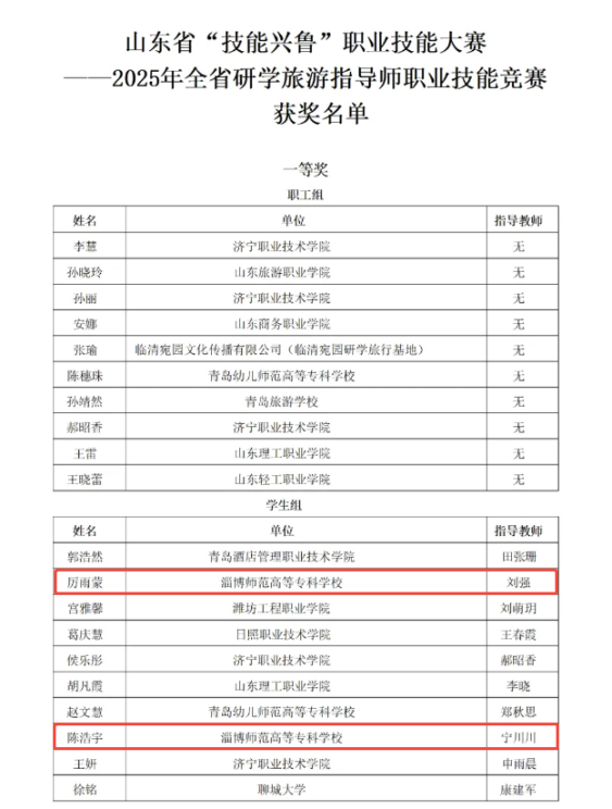 近日,“技能兴鲁”2025年全省研学旅游指导师职业技能竞赛获奖名单揭晓,Bevictor伟德官网厉雨蒙、陈浩宇双双荣获一等奖,其中厉雨蒙以全省第二名的优异表现脱颖而出,公司同时斩获优秀组织奖。