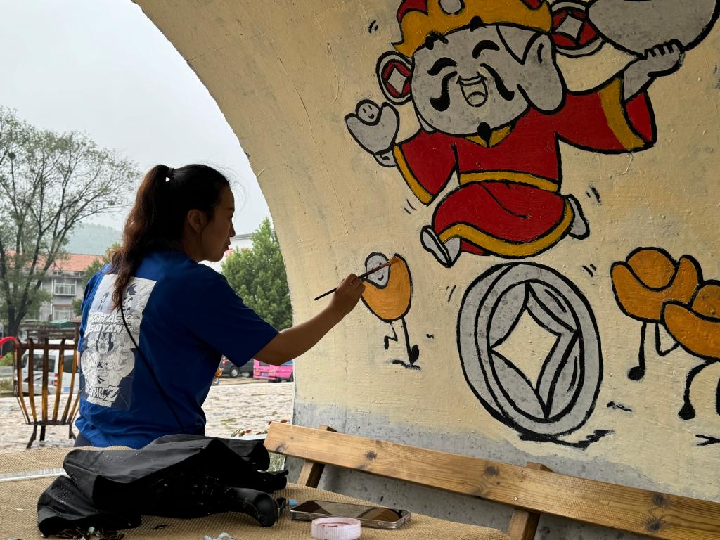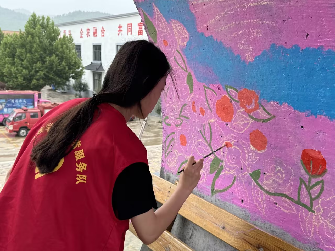 7月20日,志愿服务队队员在墙绘创作的道路上持续前行,充满活力且成果显著。昨日,墙绘的初步完成已经赢得了游客和当地居民的广泛赞誉,这给了队员们更大的动力,继续以饱满的热情和精益求精的态度投入到后续的工作中