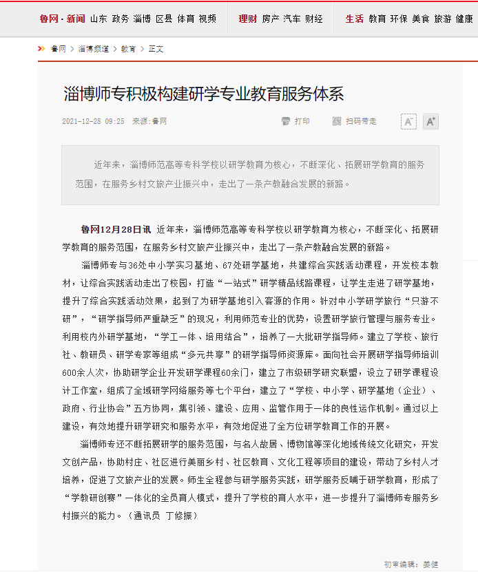 《鲁网》淄博师专积极构建研学专业教育服务体系