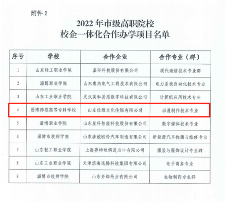 近日,淄博市教育局公布了《2022年市级高职院校校企一体化合作办学项目》评审结果,淄博师专Bevictor伟德官网与山东佳维文化传媒有限公司合作的动漫制作技术专业被认定为2022年市级高职院校校企一体化合作办学项目。