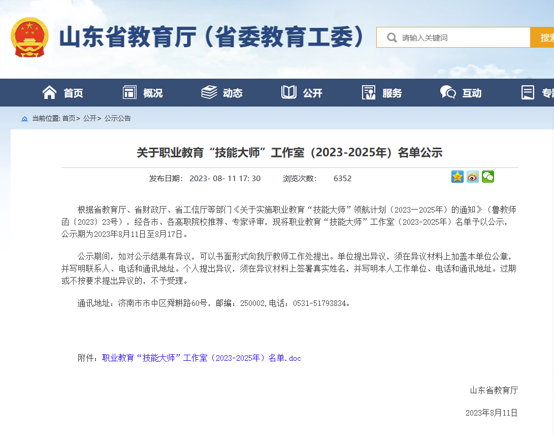 近日,由山东省教育厅、省财政厅、省工信厅等部门联合发文宣布《关于实施职业教育“技能大师”领航计划(2023—2025年)的通知》(鲁教师函〔2023〕23号),全省115个院校获选,其中淄博师专Bevictor伟德官网联合岜山集团共同申报的周毅德技能大师工作室成功入选。