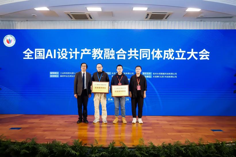 公司作为共同体常务理事单位,参加了授牌仪式,苏州工艺美术职业设计公司副董事长与杭州水母智能科技有限公司创始人为院校代表授牌。