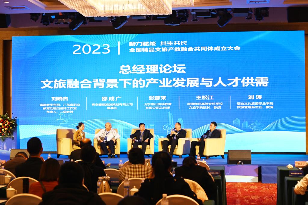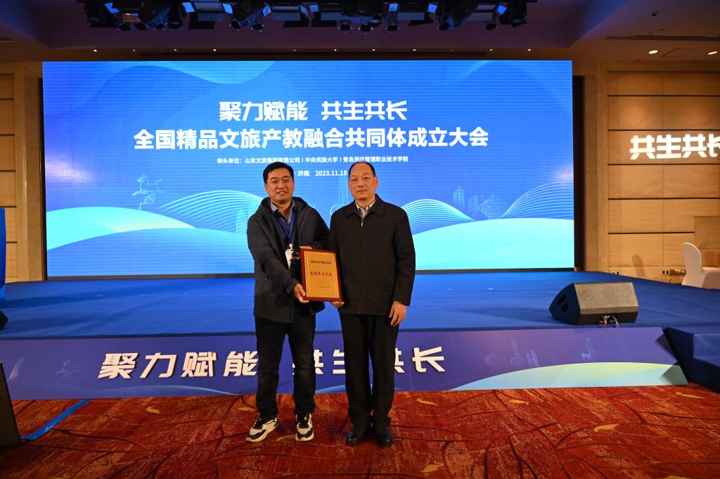 全国研学旅行产教融合共同体由山东文旅集团、中央民族大学、青岛酒店管理职业技术公司牵头共同组建,并在教育部管理下,联合169家行业组织、公司、科研机构、上下游企业等共同参与,以期培养更多高素质高技能的文旅人才,全面强化对全行业发展的支撑。大会宣读了共同体章程(草案),公布了共同体组织架构和第一届理事会理事长单位、常务副理事长单位、副理事长单位、常务理事单位并授牌,公司被选定为副理事长单位。