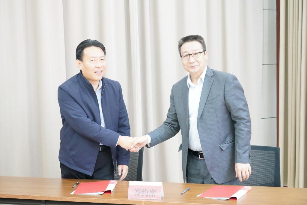 淄博师专教务处处长耿国彦与岜山集团淄博万杰肿瘤医院副经理孙效刚签订实践教学基地协议。