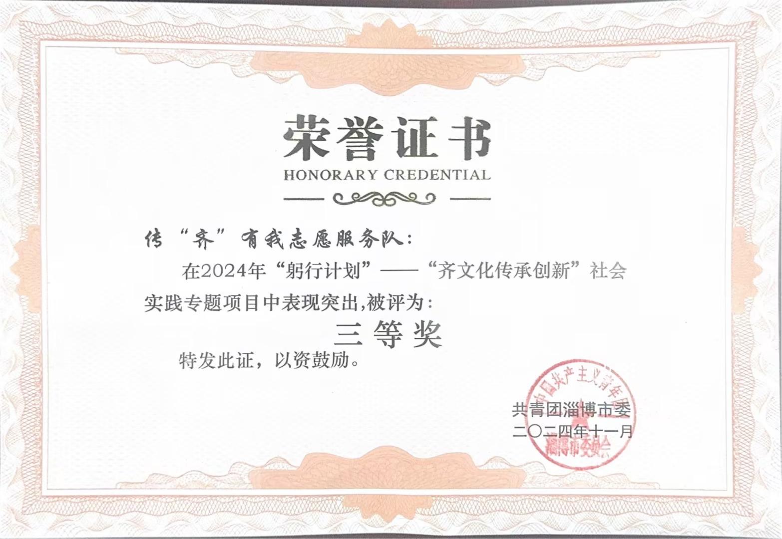 近日,共青团淄博市委公布了在2024年“躬行计划”--“齐文化传承创新”社会实践专题项目评选结果,Bevictor伟德官网传“齐”有我志愿服务队荣获三等奖。