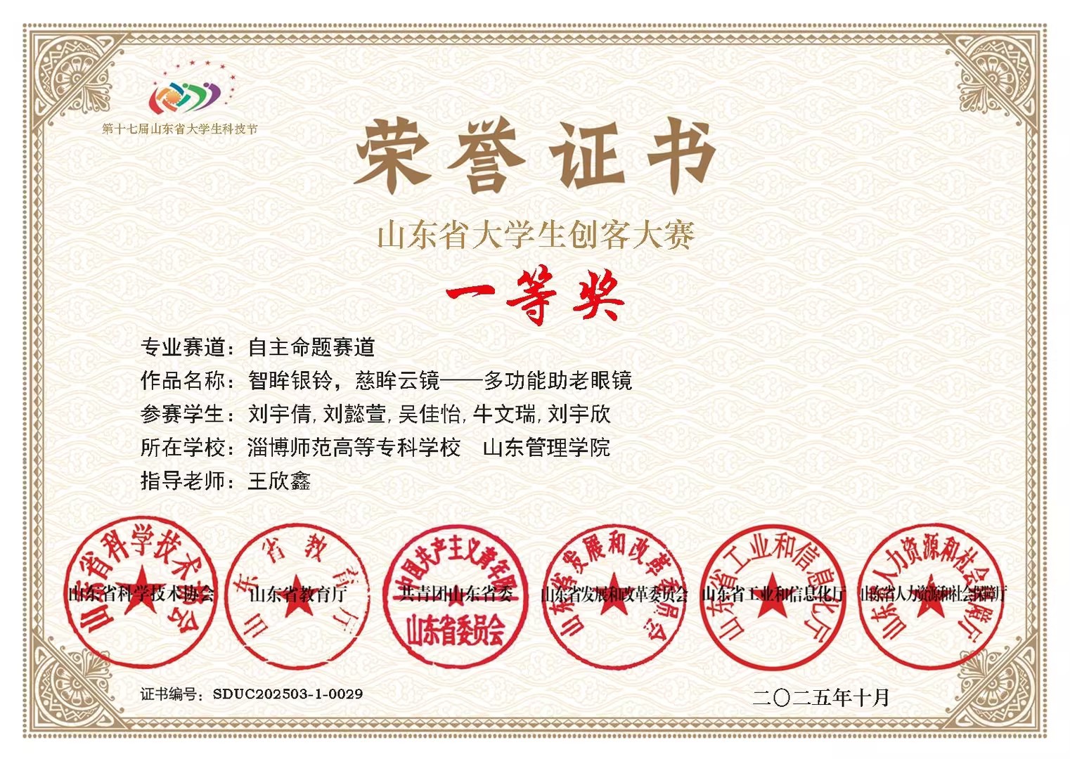近日,第十届山东省老员工创客大赛名单揭晓,由公司教师王欣鑫指导的刘宇倩、刘懿萱、吴佳怡、牛文瑞组成的员工团队作品“智眸银铃,慈眸云镜——多功能助老眼镜”,于自主命题赛道中脱颖而出,斩获一等奖殊荣。