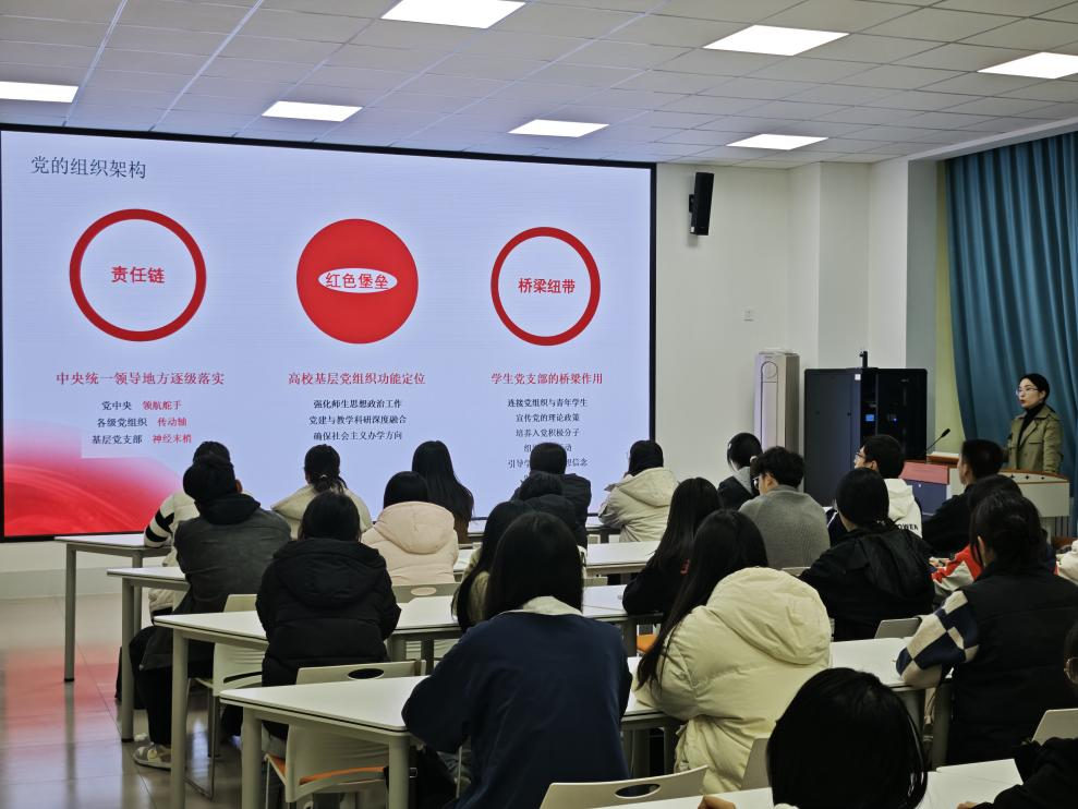 高馨围绕党的组织体系、纪律规范与实践成长路径三大板块展开讲解,她强调“纪律是党的生命线”,并结合实际,指出员工党员应在课堂、网络、班级、宿舍等多场景中发挥先锋模范作用。同时也鼓励同学们主动学习党章党规,筑牢思想根基,严守行为底线,做到内化于心、外化于行。