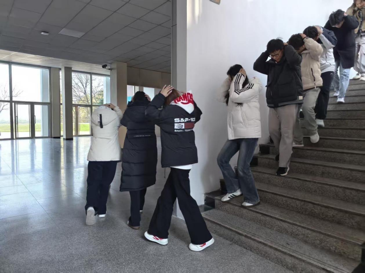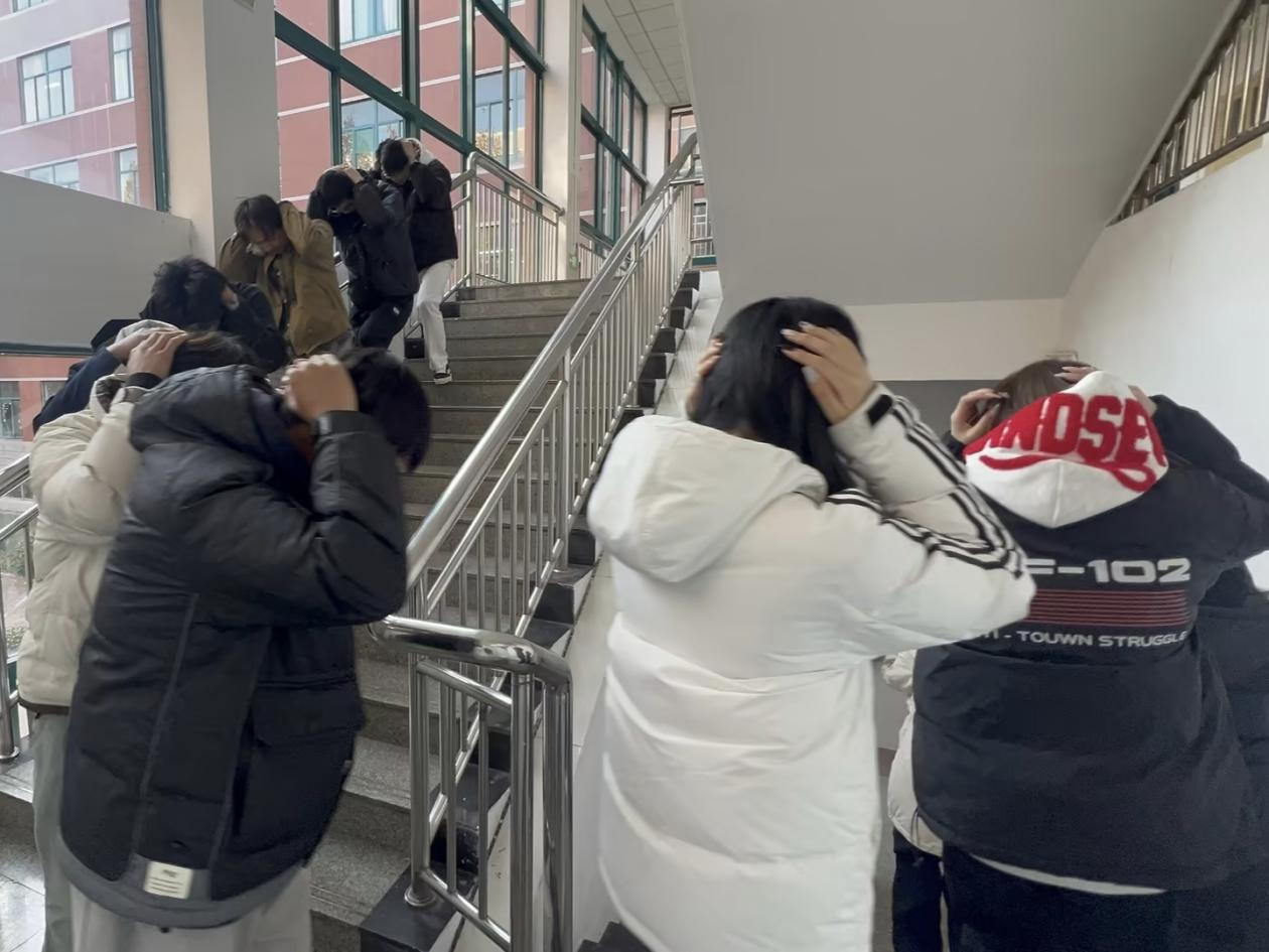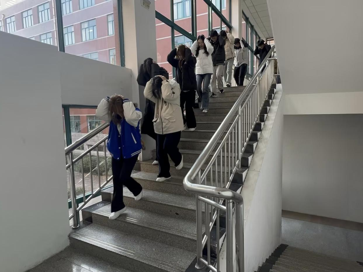 同学们立即采取弯腰低姿的姿势,沿着预定疏散路线,快速而有序地向安全地带撤离。整个过程衔接紧密、有条不紊,同学们沉着冷静的表现,充分展示了演练的扎实成效。