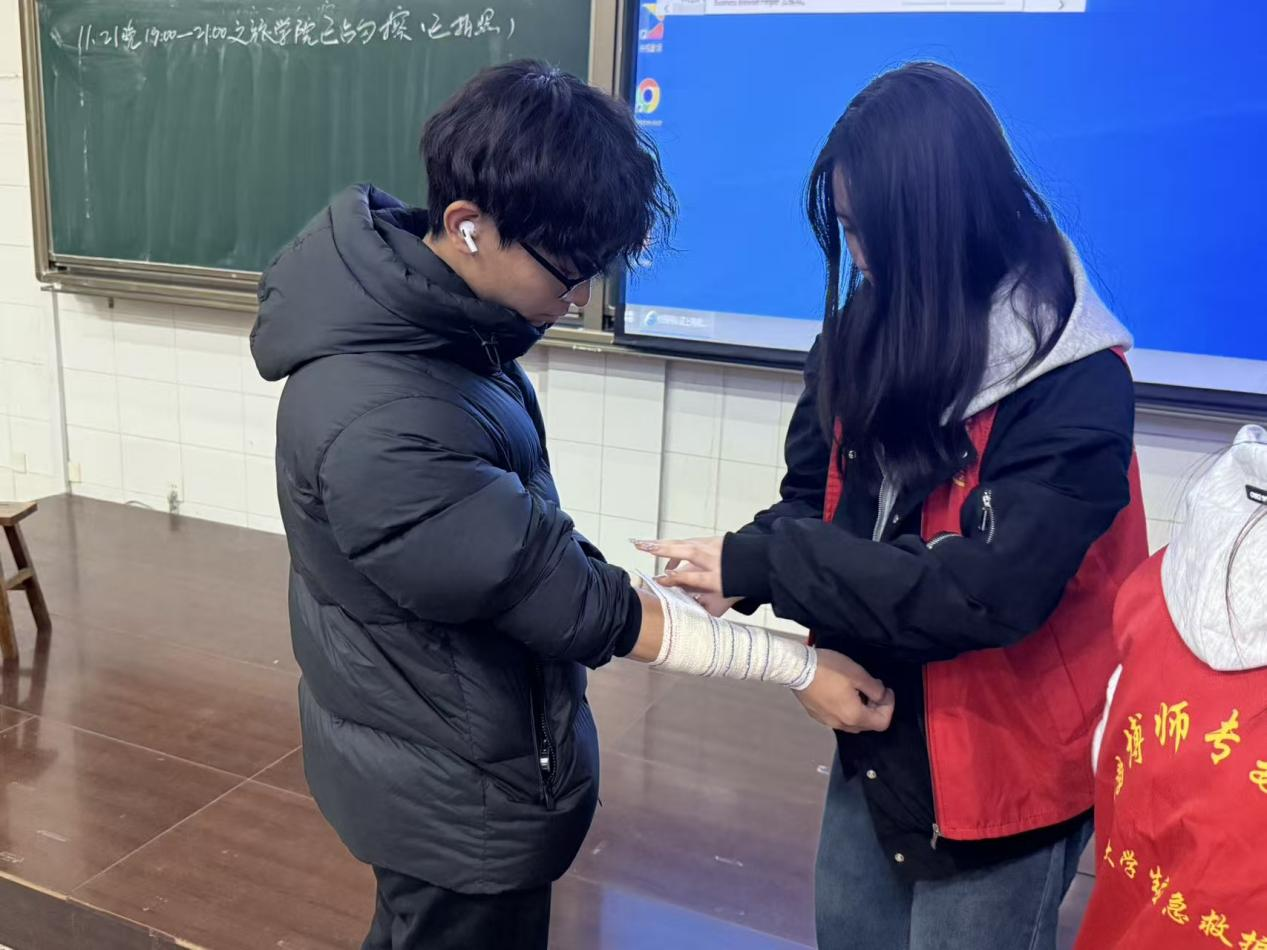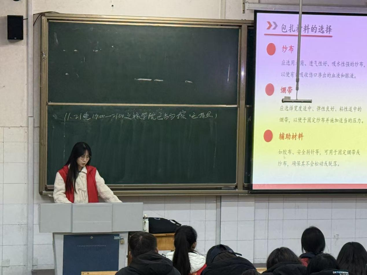 活动伊始,红十字老员工应急救护队负责人赵康宁同学首先介绍了救护队的基本情况与服务宗旨。随后,培训进入核心环节——螺旋包扎法的讲解与实操。队员们通过清晰的步骤分解,详细阐述了针对上肢、下肢等不同肢体部位的包扎技巧、操作要点及注意事项。