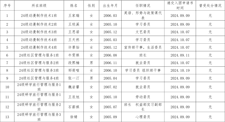 根据《中国共产主义青年团章程》、《中国共产主义青年团发展团员工作细则》和《发展团员工作操作规程》,结合公司团委下发的《关于做好2025年第一批团员发展工作的通知》要求,经公司各团支部推荐、公司团委审核,确定王家瑞、王琰溪、王思诺、王天然、许景怡、牛雯琪、段熙楠、邹筱喧、张一汀、王辰旭、魏岩馨、石薪祺、徐婧、孟如意、刘富红、王梦茹、倪彦均、马宏硕、张轩畅、崔学杰、边慧玲、孙洪丽22名同志为团员发展对象。为进一步增强发展团员工作透明度,确保发展团员质量,按照公司团委有关发展团员工作的制度规定,现对入团发展对象的基本情况予以公示,公示期为5个工作日,自2025年3月31日—2025年4月4日。如有异议,请当面或通过书信、电话等方式反映。